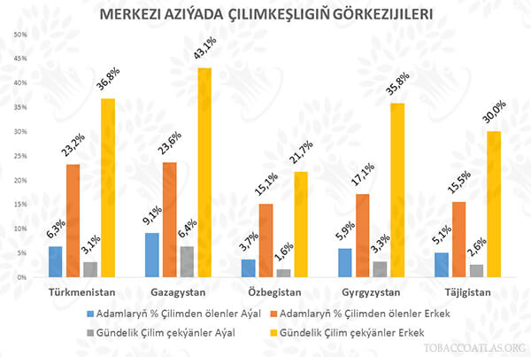 Tobaccoatlas.org maglumatyna görä, Merkezi Aziýada çilimiň bahasyna goýulýan salgytlar boýunça Gazagystan iň ýokary derejäni eýeläp, ondan soň Gyrgyzystan bilen Türkmenistan durýar. Täjigistan bolsa 3% derejede gaty pes salgyt goýýar.