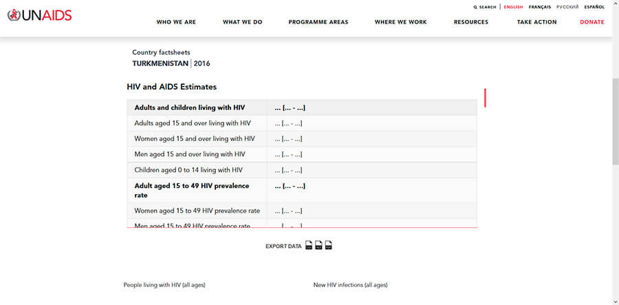 UNAIDS guramasynyň bolsa Türkmenistana degişli sahypasy boş ýatyr. Bu gaty gynandyryjy ýagdaý. Dünýädäki döwletleriň aglaba böleginiň AIW (WIÇ) infeksiýaly näsaglar barada maglumat berip, näsaglara ömrüni uzaldýan bejerişi elýeterli etmekde tagalla edýän wagtlary biz ýurdumyzda näçe sany näsagyň bardygyny hem bilmeýäris. Şeýle ýagdaý näçe adamyň ölümine sebäp bolýandyr? Bu mesele barada WHO-nyň bir sahypalyk, könelişen belligini okap bolýar.