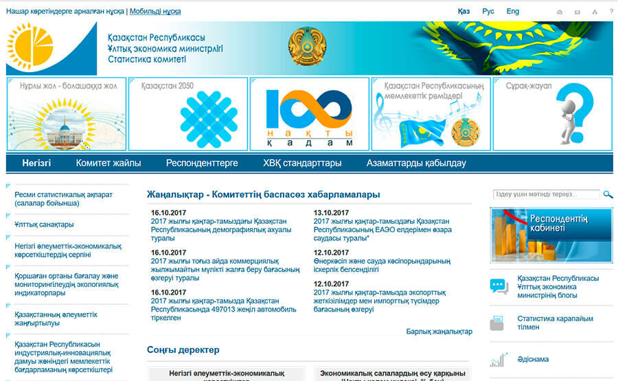 Gazagstanyň statistika boýunça komitetiniň saýty maglumatlary günde täzeläp üç dilde, mobil telefonalar üçin we gowy görmeýän okyjylar üçin sahypaly saýty alyp barýar.