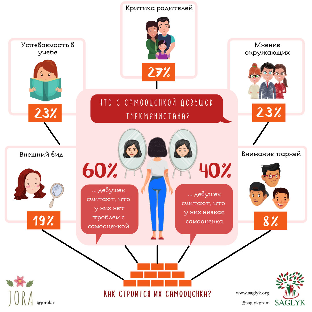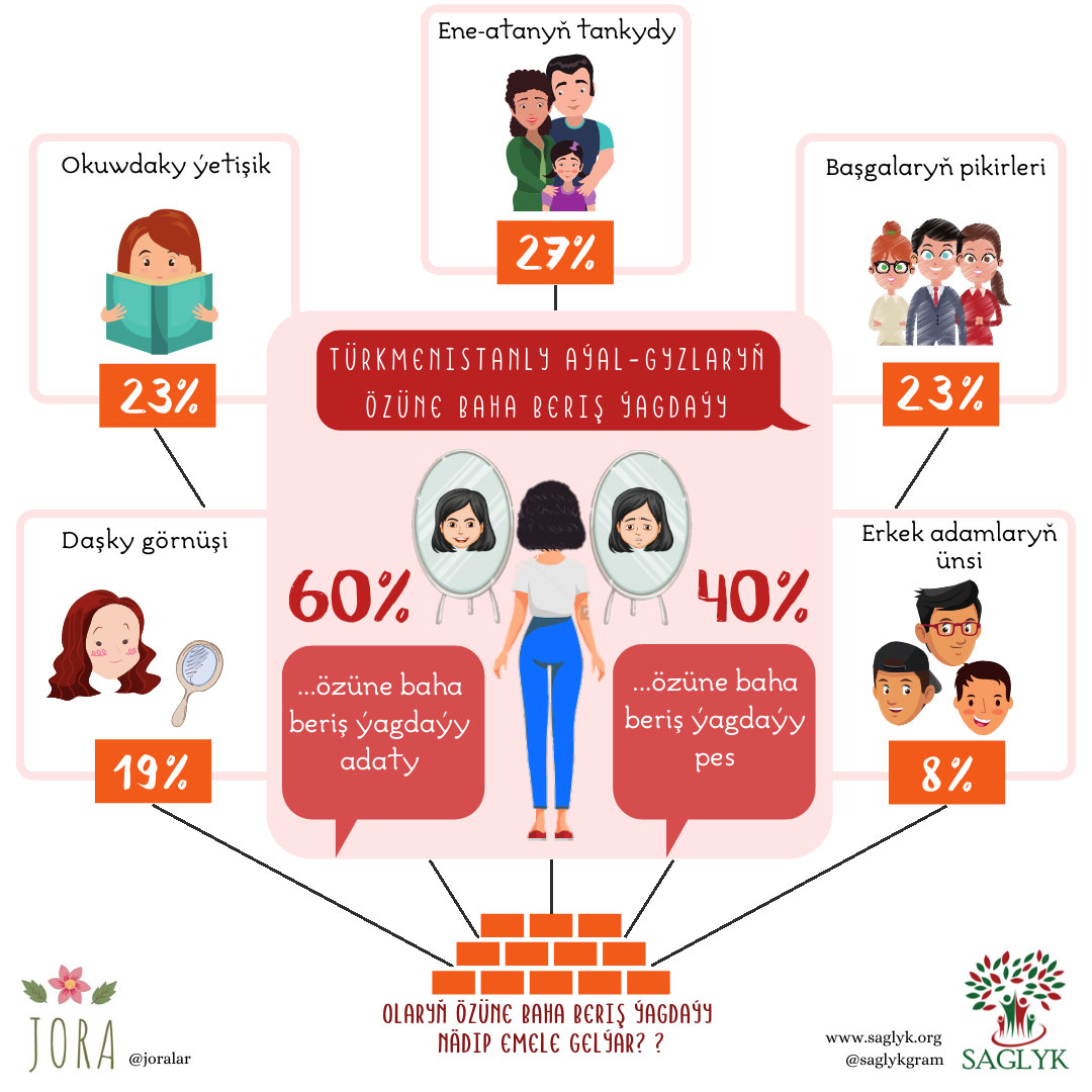 Biz ýakynda IMO-da we Instagramda gelin-gyzlaryň özlerine baha berişleri hakynda soragnama geçirdik. Soragnama 17-25 ýaş aralygyndaky abunaçy gelin-gyzlarymyz gatnaşdylar. Netijede, Türkmenistanyň gyzlarynyň we aýallarynyň 102-sinden 41 sanysy "Men özüme berýän bahamdan hoşal däl" diýip jogap berdiler.