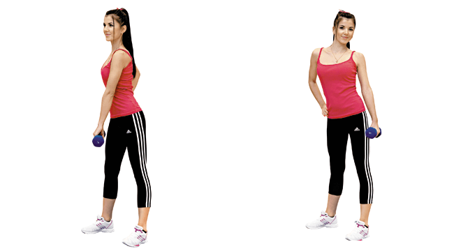2. Ilkibaşdaky durum. Aýaklaryňyzy eginleriňizi ininde goýuň. Çep eliňize agramly daşy (gantelýany) alyň. Onuň agramy 2 kileden köp bolmaly däl. Soňra çep eliňizi öň tarapyňyzda aşak goýberiň, sag eliňizi arka tarapyňyzda bolsun.