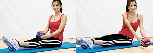4. Ilkibaşdaky durum. Ýerde oturyp, aýaklaryňyzy uzadyň (dyzyňyzy biraz epseňiz-de bolýar). Elleriňizi haýsydyr bir agramly zat (agyr top, kiçiräk kädi, gawun we ş.m.) alyň. Çanaklygyňyzdan 30 sm uzaklykda iki kagyz goýuň.
