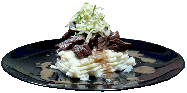 7. Suratdaky ýaly başda püre, onsoň et we üstünden sogandan taýýarlan işdäaçarymyzdan azyrak goýuň. Plastik paketdaky etden galan suwy bolsa naharyňyzyň üstüne sepeläň.