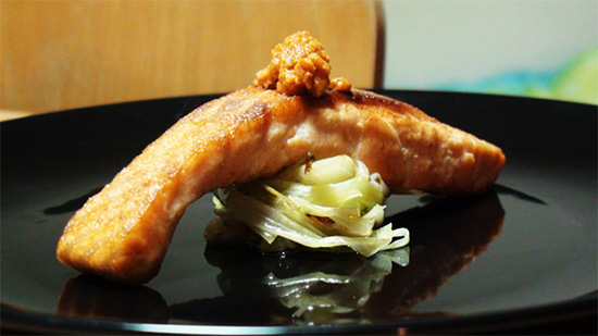 Ilki bişirilen ýaşyl sogany, onson üstüne gyzyl balygy suratdaky ýaly goýuň. Gyzylbalygyň üstüne islegiňiz boýunça pesto batyrmasyny guýup bilersiňiz. Pesto batyrmasy supermarketlerde taýýar görnüşinde satylýar. Eger-de pesto tapmasaňyz, onyň ýerine owadanlyk üçin bişiren ýaşyl soganyňyzdan alyp, taýyn tagamy owadanlap bilersiňiz.