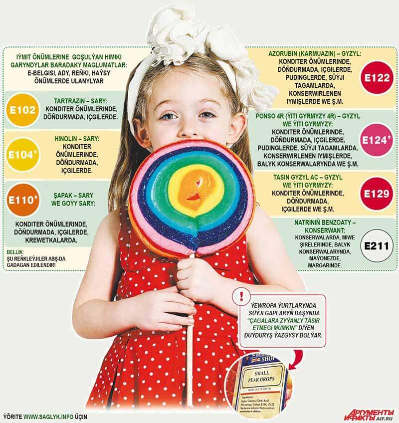 Düzümi şeýle garyndyly we konserwantly önümler sanardan kän. Olar dürli reňkli süýjülere we süýji tagamlara goşulýar. Emma şeýle iýmiti öndürýänler öz bähbitlerini arap, garaşsyz hünärmenleriň geçiren barlaglaryny ýüzleý we nädogry hasaplaýarlar. Olar reňkleýji maddalaryň zyýansyzdygy subut edildi diýip nygtaýarlar. Reňkleýjileriň adyny agzaman, GMÖ (genetiki taýdan özgerdilen önüm), gant, duz, trans ýaglar barada gürrüň edýärler.